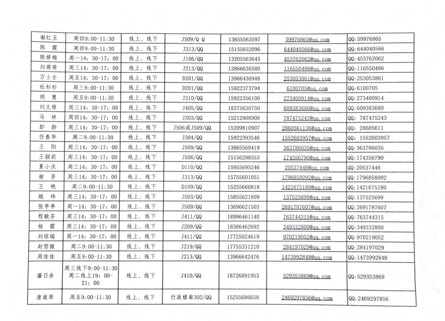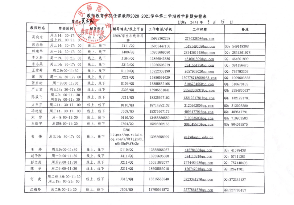 太阳成集团122ccvip任课教师2020-2021学年第二学期答疑时间安排表