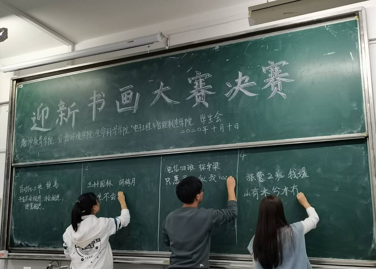 本次活动共有硬笔组、软笔组、粉笔组和绘画组四组比赛。笔走龙蛇间,遒劲有力的黑底白字跃然于眼前,粉笔组的参赛选手以积极,拼搏向上的精神面貌迎接此次决赛。比赛中,每一组选手的比赛内容都是赛前通过随机抽签决定,选手们分别根据手中不同的诗句,在黑板上认真仔细的写出自己满意的字体。