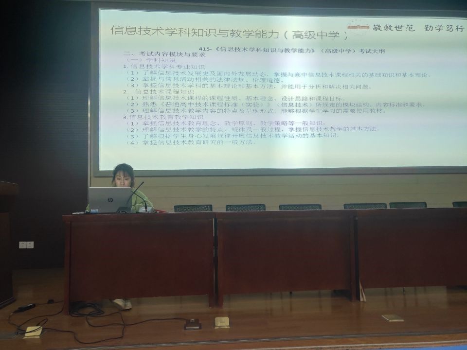 伊始,邢燕讲述了国家教团队格证的报名流程,并结合个人经历列举一些注意事项;随后,她根据本专业特点、未来发展方向,重点围绕信息技术学科教团队格证考试的内容,依次解读和分享信息技术学科的考试大纲、笔试题型、面试环节、面试技巧等,让同学们对如何考、考什么、怎样备考等问题有了更清晰的认识。最后,邢燕建议同学们早做准备,多做往年真题,合理利用网上资源,并学会总结经验,为教团队格证考试做好充分准备。