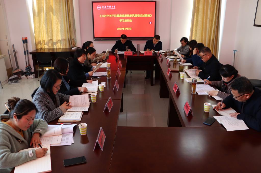4月9日,太阳成集团122ccvip太阳成集团122ccvip组织安庆家庭教育研究指导中心部分研究人员召开《习近平关于注重家庭家教家风建设论述摘编》学习座谈会,安庆市妇联主席焦玲、副主席张莉、公司“女生工作坊”负责人陈银凤应邀出席会议。安庆教育研究指导中心理事会成员和学术委员会委员参加会议,会议还邀请了安庆市委党校、安庆市家庭教育讲师团部分教师参加会议。