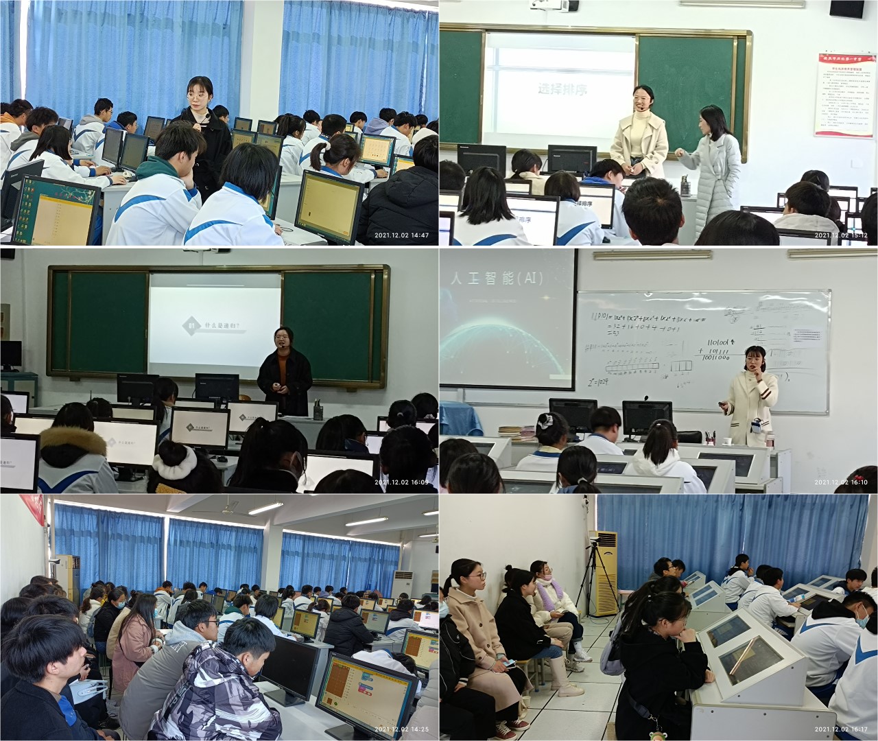 谭闵、唐演汇、范静怡、许程娟等四名同学与石化一中信息技术教师同台竞技,分别以《切水果游戏》《选择排序》《递归算法》《人工智能应用》为题,给高中生上了四节公开课。何钧军带领蒋丰、俞婷、欧阳涛、陆飞等信息技术教师一同听课,并在课后及时开展评课活动。在褒奖赞誉每位同学的同时,也一一指出存在的不足。何钧军认为,公司教育技术学专业2019级员工的综合素质非常高,师范生基本功非常扎实。
