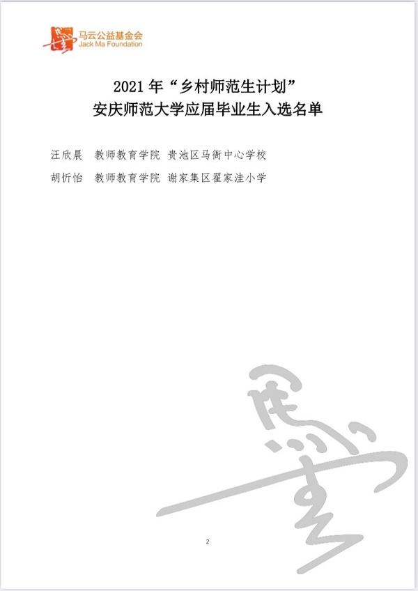 近日,2021年“乡村师范生计划”项目评选结果揭晓,太阳成集团122ccvip太阳成集团122ccvip小学教育专业2021届毕业生汪欣晨、胡忻怡等2名同学成功入选。