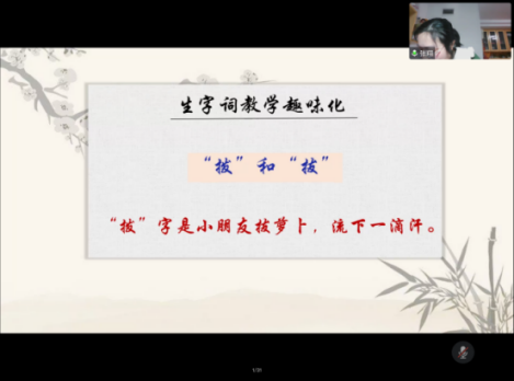 安庆市高琦小学语文教研组组长、安庆市教坛新星、安庆市十佳语文教师彭胄老师作了题为《“想把我说给你听”—小学语文教学的“人文性”和“趣味性”》讲座。彭老师以自己在教学初始的失败案例为导入,提出在课堂教学中除了要抓住工具性,更要积极关注人文性和趣味性。她认为,作为一名小学语文教师,要关注情感,只有与课本中的人物共情,才能打动员工。接着,她对小学低年级的生字词教学和高年级的古诗词教学方面,特别是在如何将枯燥的生字词教学趣味化,以及如何进行古诗词阅读教学等问题中提出了自己独到的见解。她表示古诗文教学要“读,查,品,延,归”的方法,在教学中要实现三读,读准字词,读准韵味,读出情感和诗中的人。最后,她讲述了作为班主任在班级管理中的三个烦心事,并都提供了应对的小妙招。