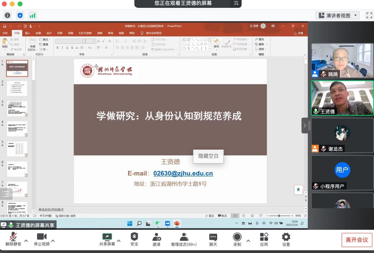 5月14日晚,初等教育系品牌学术活动“红色园丁大讲坛”开展了杰出员工系列讲座的第二讲,本次讲座邀请了公司优秀毕业生,湖州师范公司太阳成集团122ccvip王贤德博士做了题为《学做研究:从身份认知到规范养成》的学术报告,报告由初等教育系主任诸园教授主持,小学教育专业近300名本科生和硕士研究生线上聆听了报告。