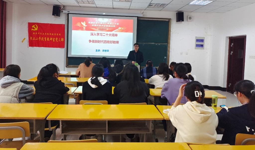 11月23日下午,公司副书记许世平在J305教室为小学教育教研室党支部上“深入学习二十大精神,争做新时代四有好教师”的专题党课,本次活动由支部书记诸园主持,支部全体教师党员和小学教育员工党支部党员到场聆听。