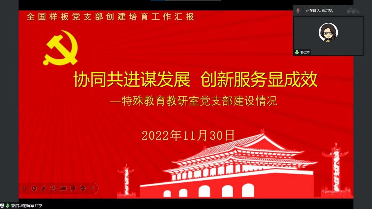 郭启华围绕特殊教育教研党支部建设情况展开具体论述。她表示,两年多来,在校院两级党委的坚强领导和公司相关部门的悉心指导下,特殊教育教研室党支部对标新时代支部培育创建目标,立足党建与发展的互融共促,全面贯彻落实党的教育方针,聚焦“红色园丁”培育目标,在公司人才培养与建设发展中积极发挥作用,助力校地深度合作,为地方性应用型高水平大学建设提供了有力支撑。2019年12月,公司特殊教育教研党支部获批为第二批“全国党建工作样板支部”培育创建单位,2022年7月顺利通过验收。