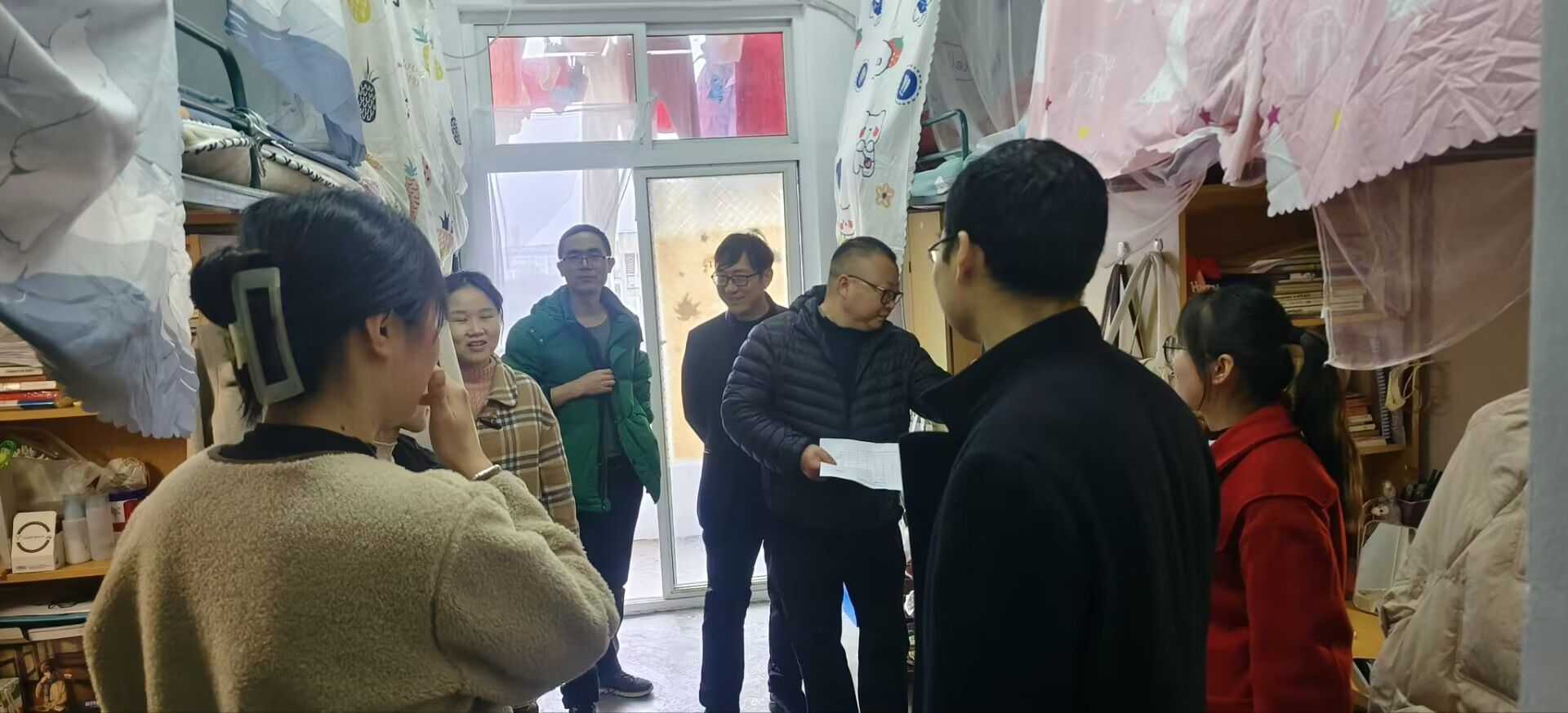 排查过程中公司领导老师与同学们亲切交流。吴云助对宿舍文明建设、环境卫生和日常作息提出相关要求,强调同学们要遵守公司宿舍管理规定,要注意财产安全、用电安全和人身安全,建议加强寝室清洁管理,注重培养良好的生活方式,在宿舍相处中要友爱互助,发挥好室友之间相互督促、共同进步的作用,并勉励同学们勤奋学习,做好学习和就业规划,营造良好的学习氛围。