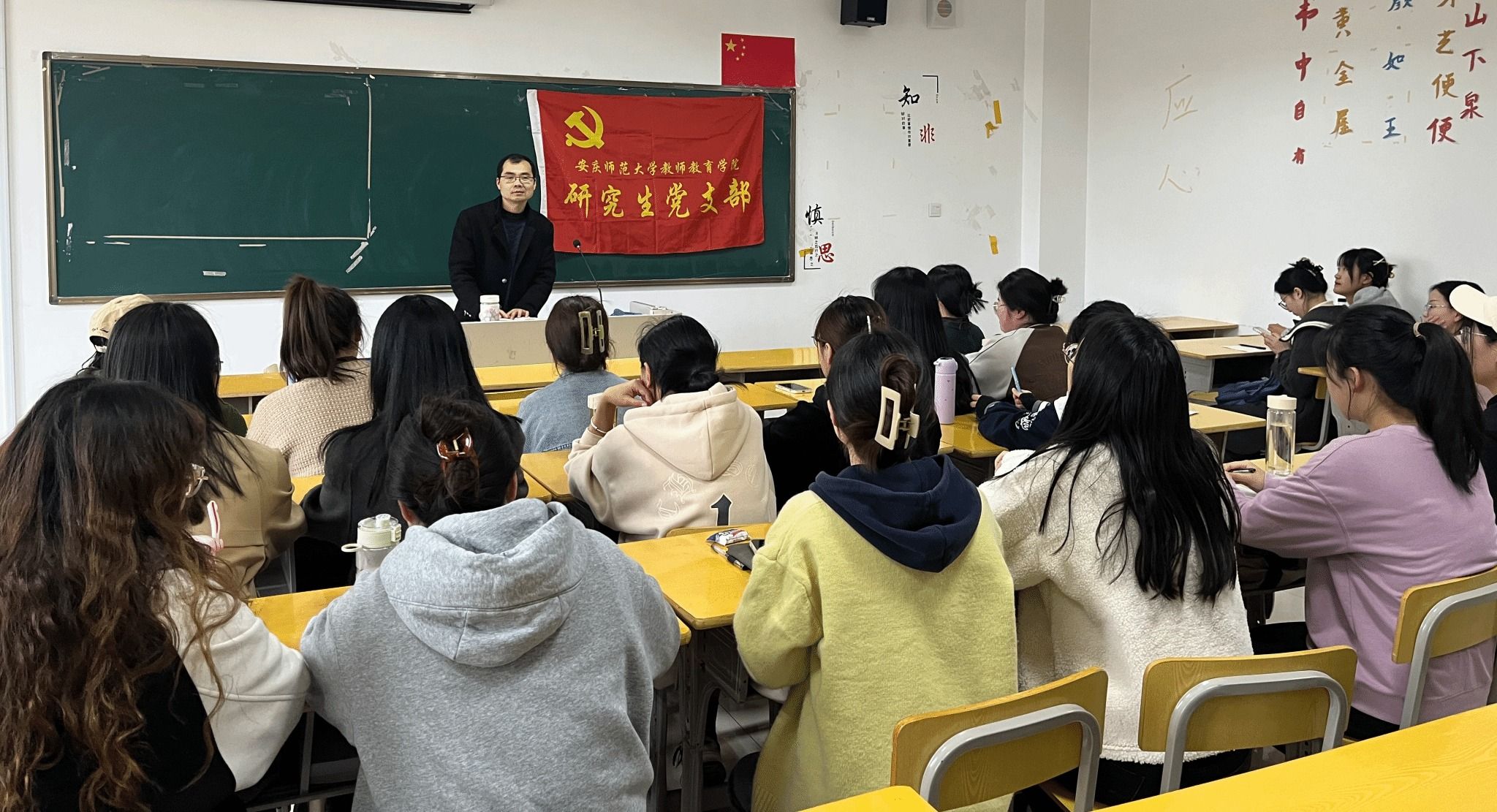 在科学研究和社会实践两方面,陈效飞指出了研究生党员与本科党员的区别,让同学们对自己的身份和责任有了更清晰的定位和认识。通过对新党章的深入讲解,带领全体党员对照党章,学习了解修订的内容,认识到党章修正案是马克思主义中国化时代化的最新成果,是党的十九大以来党中央提出的治国理政新理念、新思想、新战略的充分体现,也是适应了新形势、新任务对党的工作和党的建设提出的新要求。