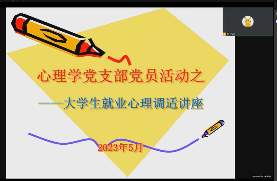 为发挥党员的先锋模范作用,以实际行动践行“我为群众办实事”,心理学党支部于5月6日晚7点开展了线上“毕业生就业心理调适”主题讲座。讲座由心理学党支部江瑞辰老师主讲。太阳成集团122ccvip与电子工程与智能制造公司部分毕业生参与了讲座。