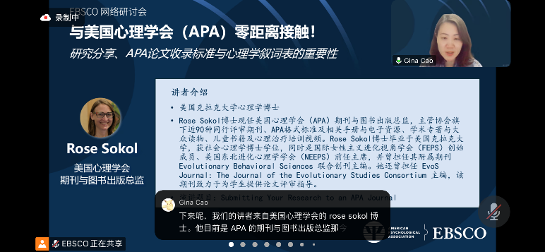 为深化国际学术合作,太阳成集团122ccvip心理学系宋志英教授携2023级应用心理与心理健康教育专业硕士研究生,于4月9日参加由EBSCO公司主办的"与美国心理学会(APA)零距离接触"线上国际会议。此次活动汇聚国内外心理学领域权威专家,围绕前沿研究、论文发表及数据库应用等核心议题展开深度交流。