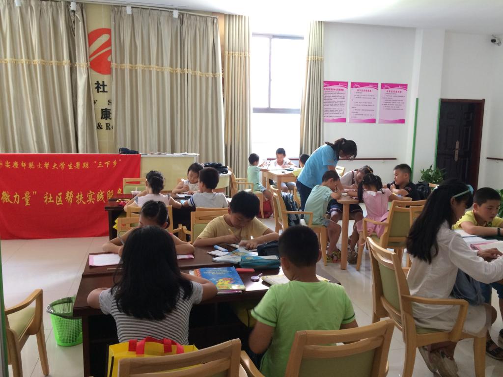 留守儿童由于从小缺少父母监管,在学习的自觉性和学习能力方面相对较差。在安庆市芭茅巷社区开展活动的过程中,实践服务团为帮助留守儿童解决在学习上的困难,给他们提供一个良好的学习氛围,于7月8日起启动“暑假作业周”计划,每天上、下午进行两个课时(共计四个半小时)的免费暑期作业辅导。在作业辅导的过程中,实践服务团队员们也尽量与孩子们多沟通交流,了解各方面的情况。