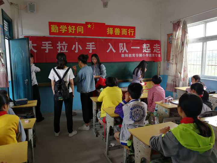 戴上红领巾,成为一名光荣的少年先锋队队员,是每个小学生最期待的事情。2018年5月30日,2017级小学教育二班的同学们在班级团支部的带领下,怀揣着激动的心情又来到了立新小学开展“大手拉小手,入队一起走”主题团日活动,为那里的小员工举行了一次特殊的入队仪式。
