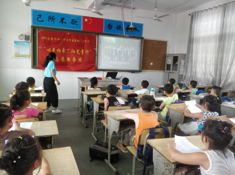 手语是聋哑人的交流方式,通过手指、肢体等动作表达一定意思和词语。“心手相牵 阳光童行”团队成员范俊楠首先为孩子们播放了一段手语视频,让他们接触手语,也让孩子们更好地了解聋哑人这个特殊群体,带领他们走进无声的世界。手语不仅仅是一种用于特殊交流的语言,它更是一种表演的艺术形式。“通过对手语的学习,不仅可以使大家有了与聋哑人交流的基础,而且有利于自己身心的健康发展,增强自己的综合素质。”范俊楠说。