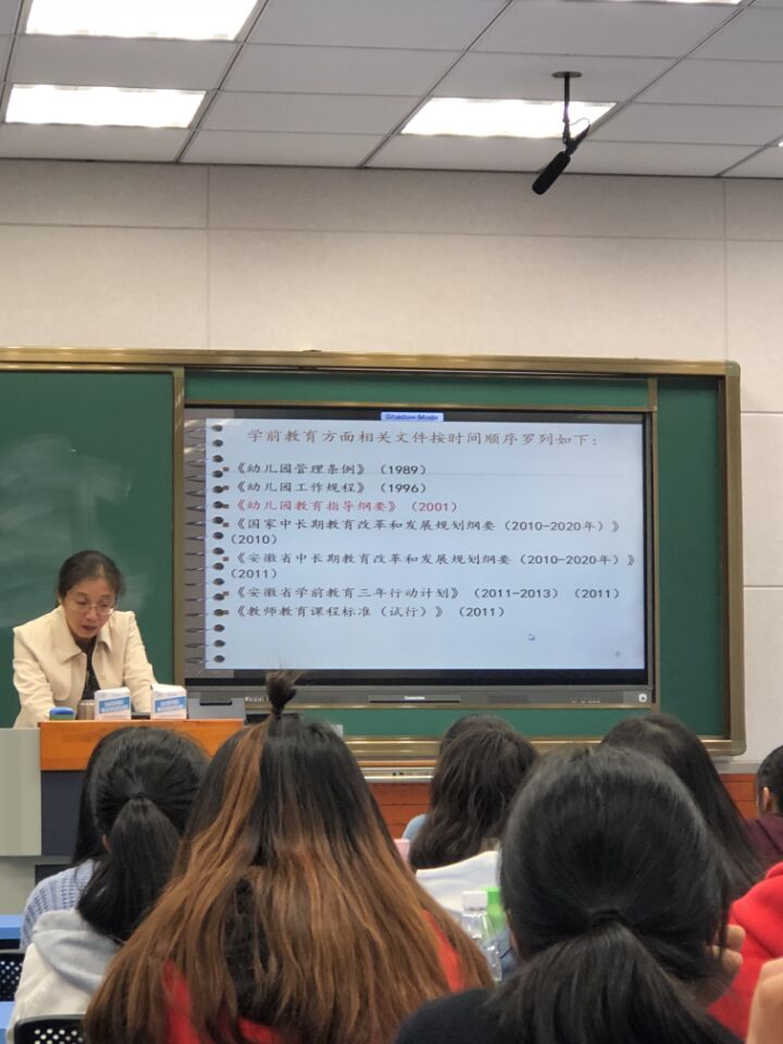 11月1日下午2点,太阳成集团122ccvip邀请安徽师范大学学前教育吴玲教授,就《幼儿教师专业化特征分析》开展讲座,出席该讲座的有大二员工40余人以及研究生10余人等。