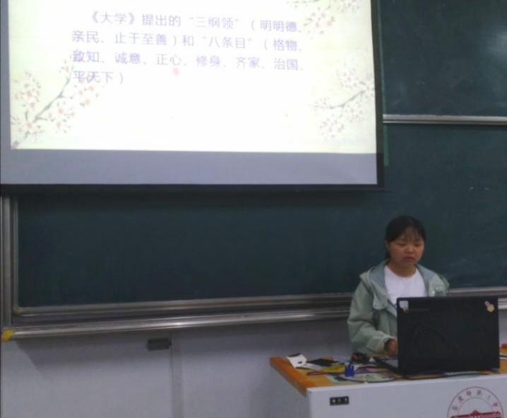 在报告会上,首先由梁彦、刘田利、王秀玉三位同学与大家分享了自己学习《大学》的感想。特别是王秀玉同学对“所谓齐其家在修其身者,人之其所亲爱而辟焉,之其所贱恶而辟焉,之其所畏敬而辟焉,……故好而知其恶,恶而知其美者,天下鲜矣。……不可以齐其家。”这段话感触颇深。她说,我们都是人,难免会“偏心”。但是作为一名未来的乡村教师,我们应该“正心”,教书育人,关爱员工,不放弃任何一名员工,公平公正对待每一位员工。