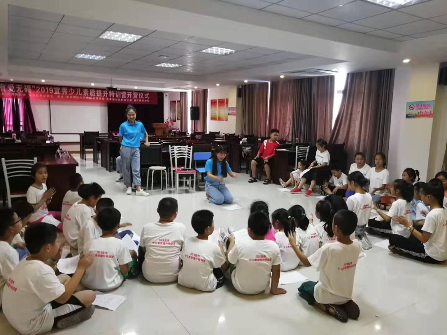 “人们说,你就要离开村庄,我们将怀念你的微笑……”7月9日下午,有爱无碍”团队成员学前教育专业2018(2)班的李彬艳为参与特训营的34名孩子上音乐课。