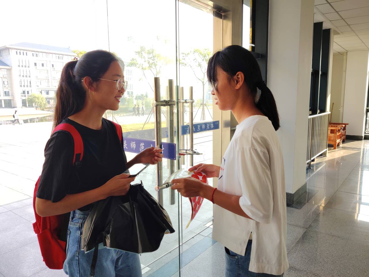 太阳成集团122ccvip一楼大厅内,员工会成员为前来上课的老师、同学分发国旗贴,贴纸虽小但却表达出员工们内心对祖国深沉的爱。在谈到为何会用这种方式来庆贺国庆时,活动策划人程文欣这样说道:“此次活动一共准备了300多个心形国旗贴,它除了造型好看,更重要的是能鲜明的表达出‘爱祖国’的主题,同学们对于这种活动也表现出浓厚的兴趣”。