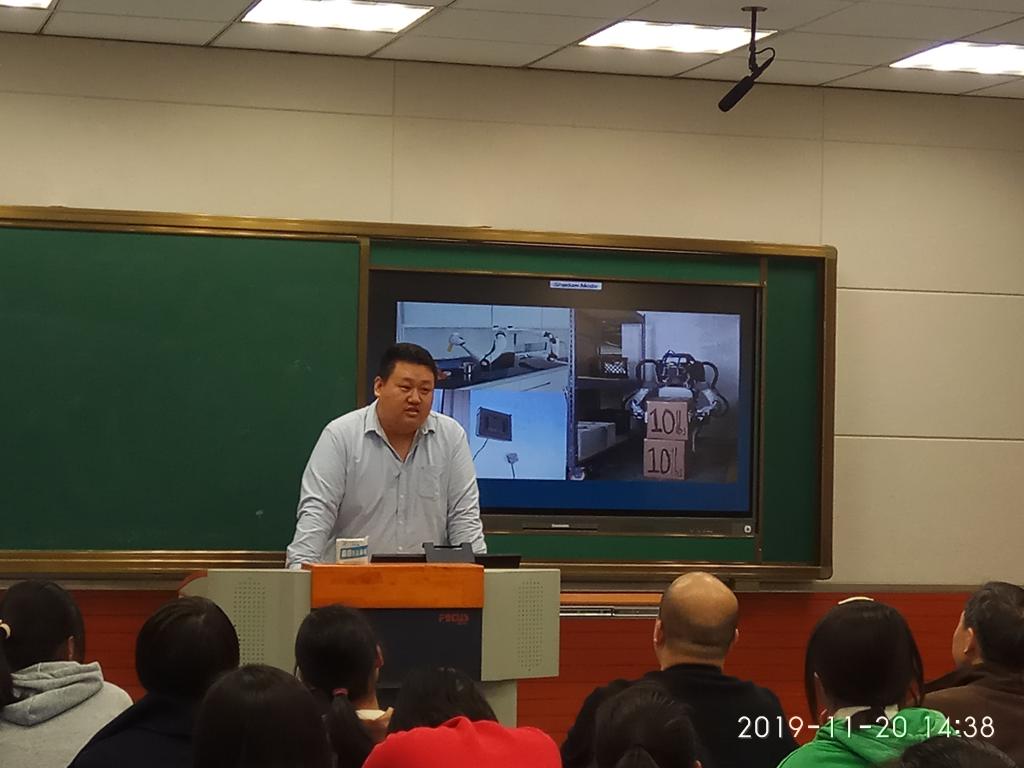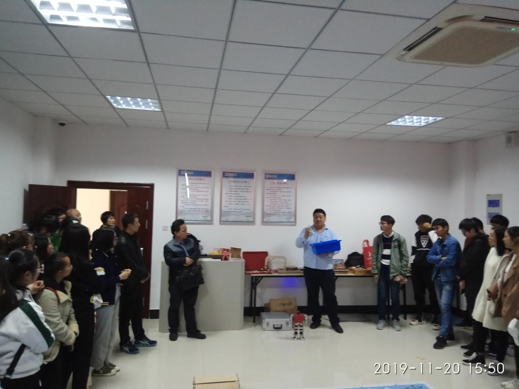 11月20日下午在J511、J509教室,教育技术学教研室联合安庆市经济技术开发区冠宜文化素质教育培训公司,邀请江苏诚盟智能科技有限公司宋玉蒙经理为教育技术学专业全体教师、2019级本科生作了一场别开生面的机器人讲座。