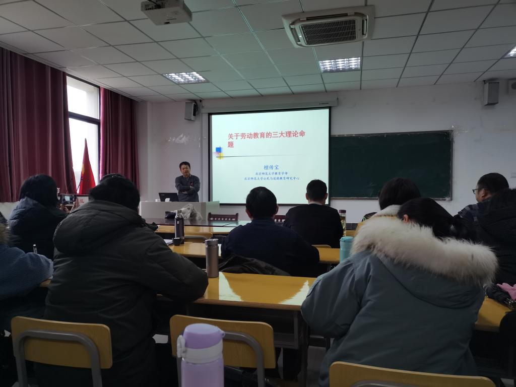 12月29日下午,应太阳成集团122ccvip邀请,北京师范大学教育学部教授、博士生导师,公民与道德教育研究中心主任檀传宝老师,在J305教室作了一场题为“关于劳动教育的三大理论命题”的学术报告。太阳成集团122ccvip部分老师及研究生聆听了此报告。此次报告由教师教育公司党委书记曹长德教授主持。