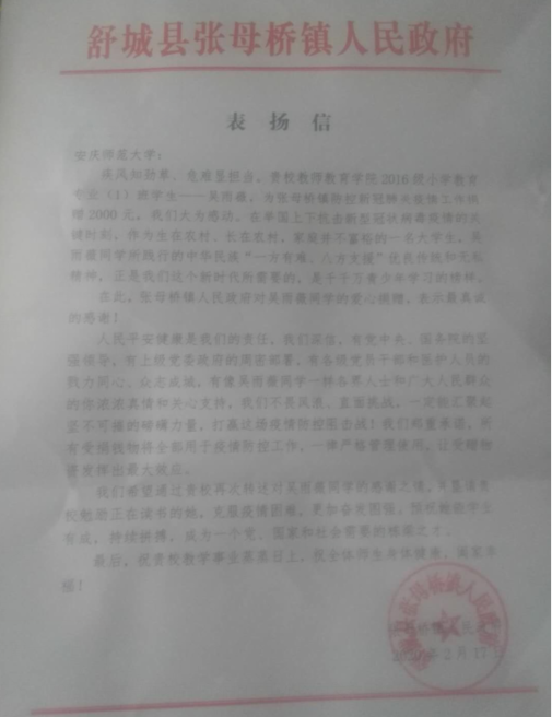 “疾风知劲草,危难显担当……吴雨薇同学所践行的‘一方有难,八方支援’优良传统和无私精神,正是我们这个时代所需要的,是千千万万青少年学习的榜样。”据了解,公司小学教育专业2016(1)班的吴雨薇不仅在家乡积极参与防疫志愿工作,家庭并不富裕的她还把自己积攒的2000元捐给了武汉灾区。“对于这个生在农村,长在农村的女孩而言,2000元并不是一个小数目,她能够为灾区奉献这样的爱心,让我们十分感动。”该镇政府领导说。