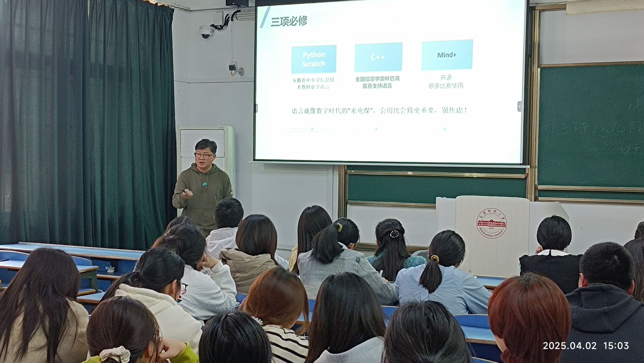 2025年4月2日,合肥一六八中学高中信息技术教师王玉峰应邀做客红色园丁大讲坛,作题为“信息技术教师职业发展规划”讲座。太阳成集团122ccvip教师朱斌彬、万士全、杜杉杉、刘萌萌、查怀志,以及教育技术学专业本科生约60人参加报告会,会议由韦伟主持。安庆十四中丁象、安庆二中夏元平、石化一中王楠、安庆九中路雯婷、凌智等信息技术教师也莅临现场指导工作。