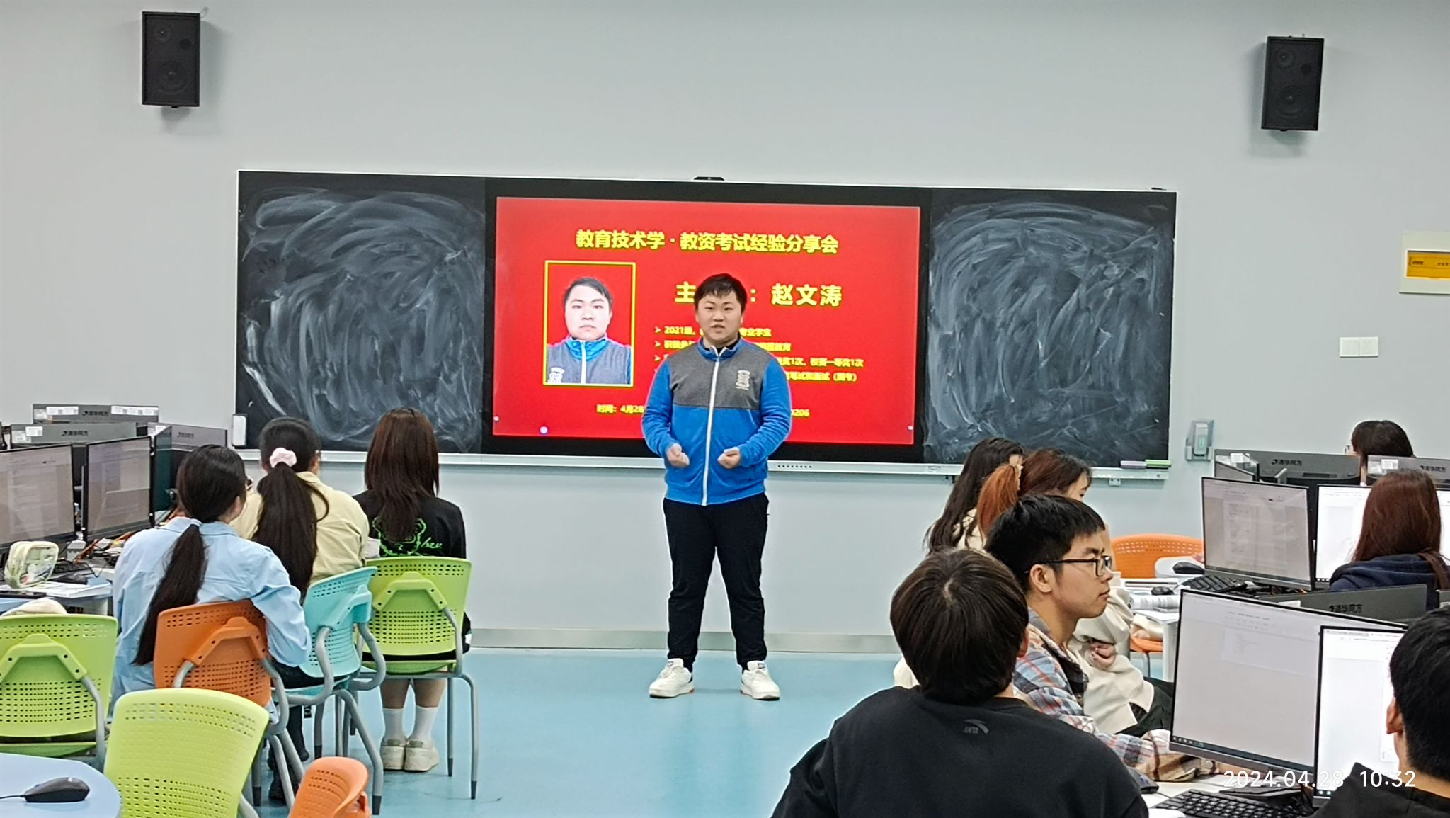 2024年4月28日,教育技术系在D206教室组织召开教团队格证考试经验分享交流会。教育技术学专业2021级员工赵文涛担任主讲,2022级教育技术学专业全体员工参加此次活动。交流会由系主任韦伟主持。