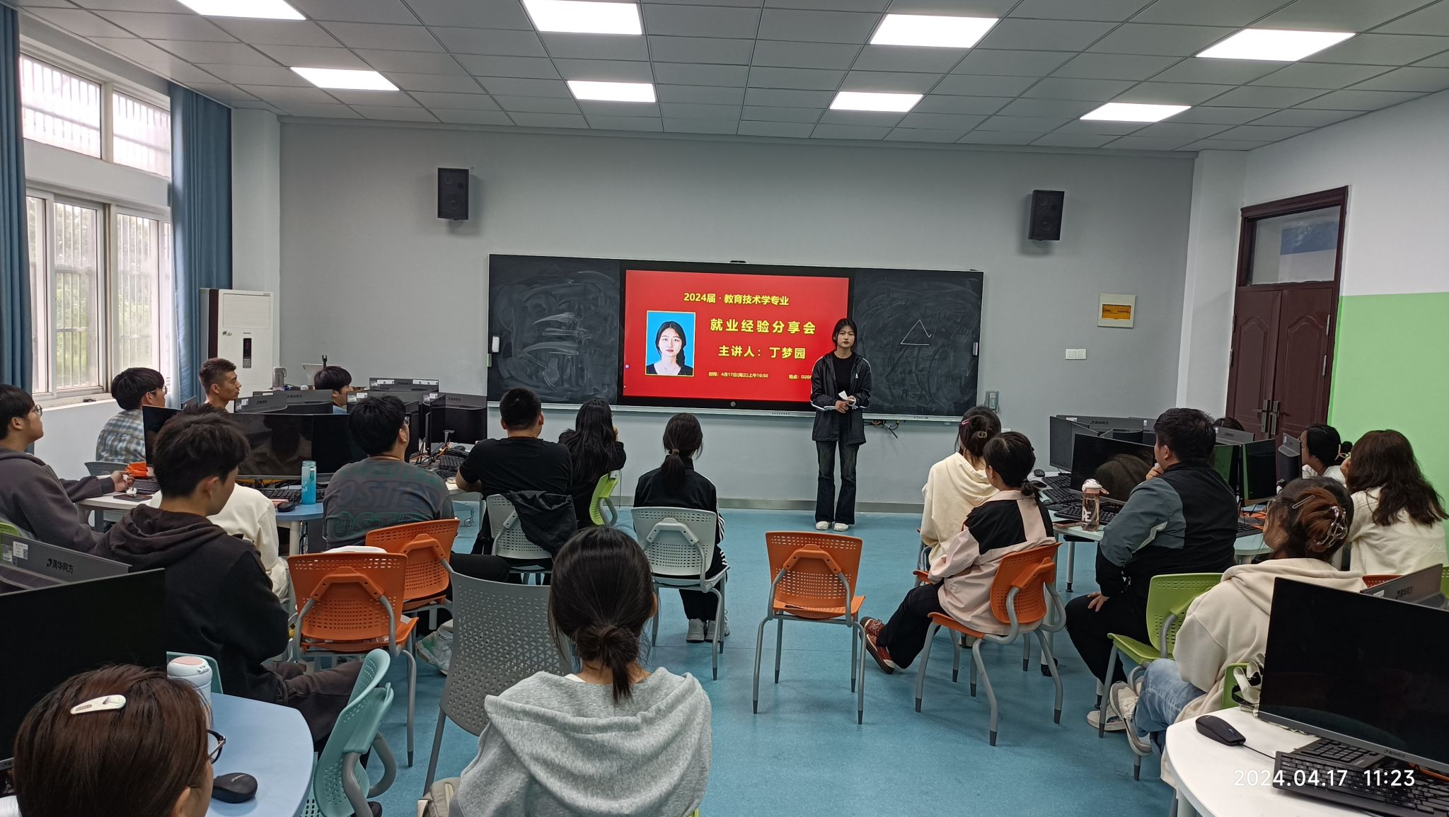 2024年4月17日,太阳成集团122ccvip教育技术系在D206教室举行毕业生就业经验分享交流会。教育技术学2024届毕业生代表丁梦园担任主讲,2021级全体员工参加。活动由系主任韦伟主持。