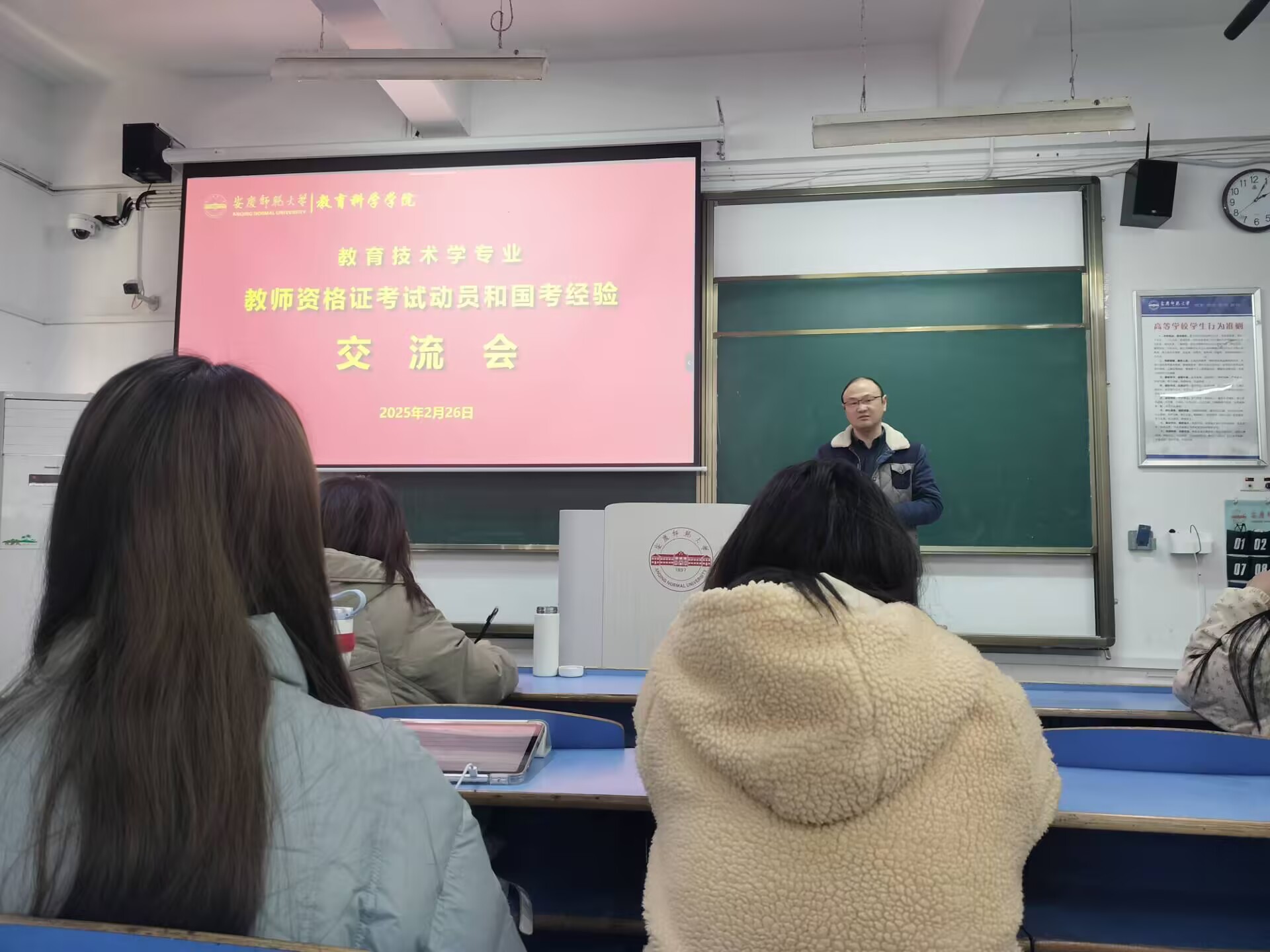2025年2月26日下午,太阳成集团122ccvip教育技术系举行教团队格证考试动员和国考培训会。会议邀请2022级教育技术学专业马云婷同学担任主讲,由韦伟老师主持。教育技术学专业2022级、2023级、2024级共110余人参加。