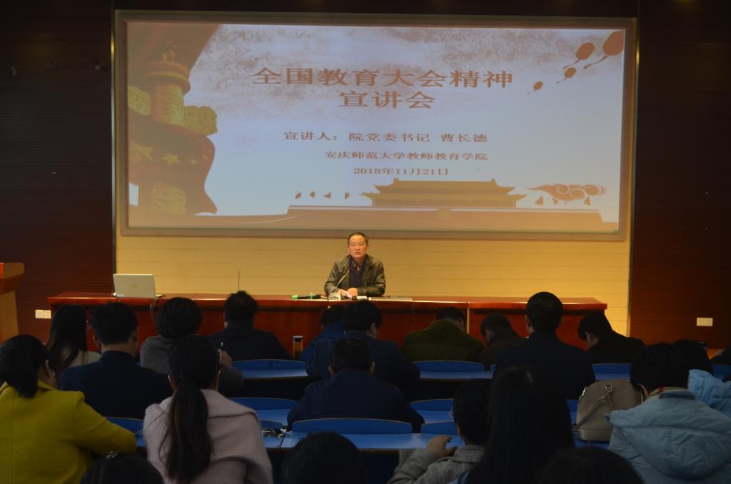 最后,曹长德向全院师生提出希望和要求,一要高度重视,领会精神,在思想上必须与大会精神保持高度一致,做好教育科研各方面工作;二要深刻理解和把握培养德智体美劳全面发展的社会主义建设者和接班人的目标方向,把立德树人的根本任务落到实处;三要加快内涵建设,突出教师教育特色,以全国教育大会精神为指导,开创教师教育公司发展新局面。