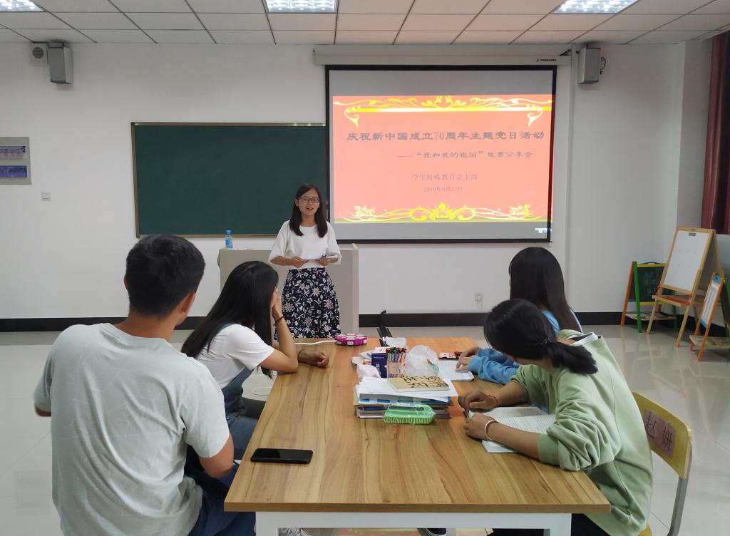 9月27日下午,员工特殊教育党支部在J405教室组织开展庆祝新中国成立70周年主题党日活动,开展“我和我的祖国”故事分享会,活动由党支部书记刘文丽主持。
