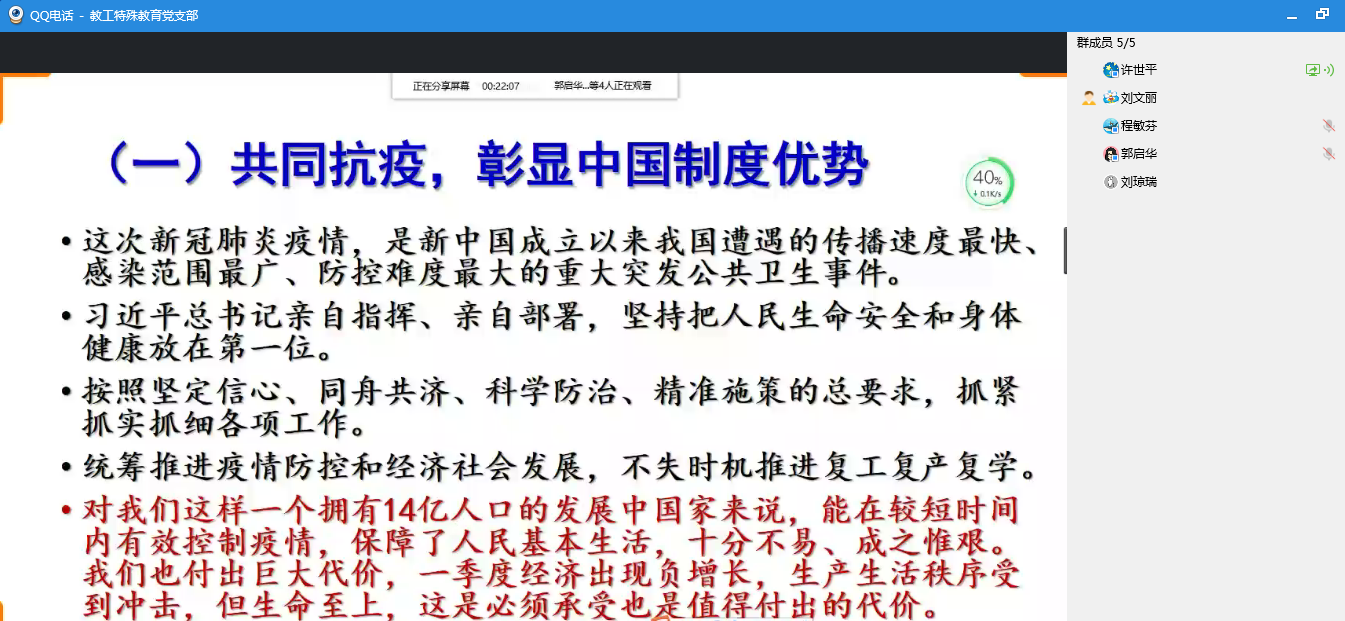 6月30日下午,公司党委副书记许世平在会议室J202进行了题为“学习领会2020年‘两会’精神”的主题党课,教工特殊教育教研室党支部和机关党支部的所有教工党员参与学习,此次党课采取线上线下相结合的方式进行。