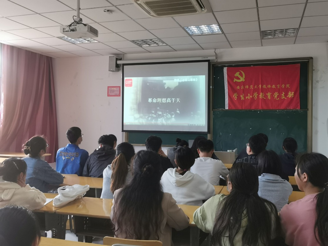3月31日下午4时,员工小学教育党支部员工党员在J楼219教室观看学习《一百堂党史课》第一讲“革命理想高于天”,深化党史认知,交流心得体会。