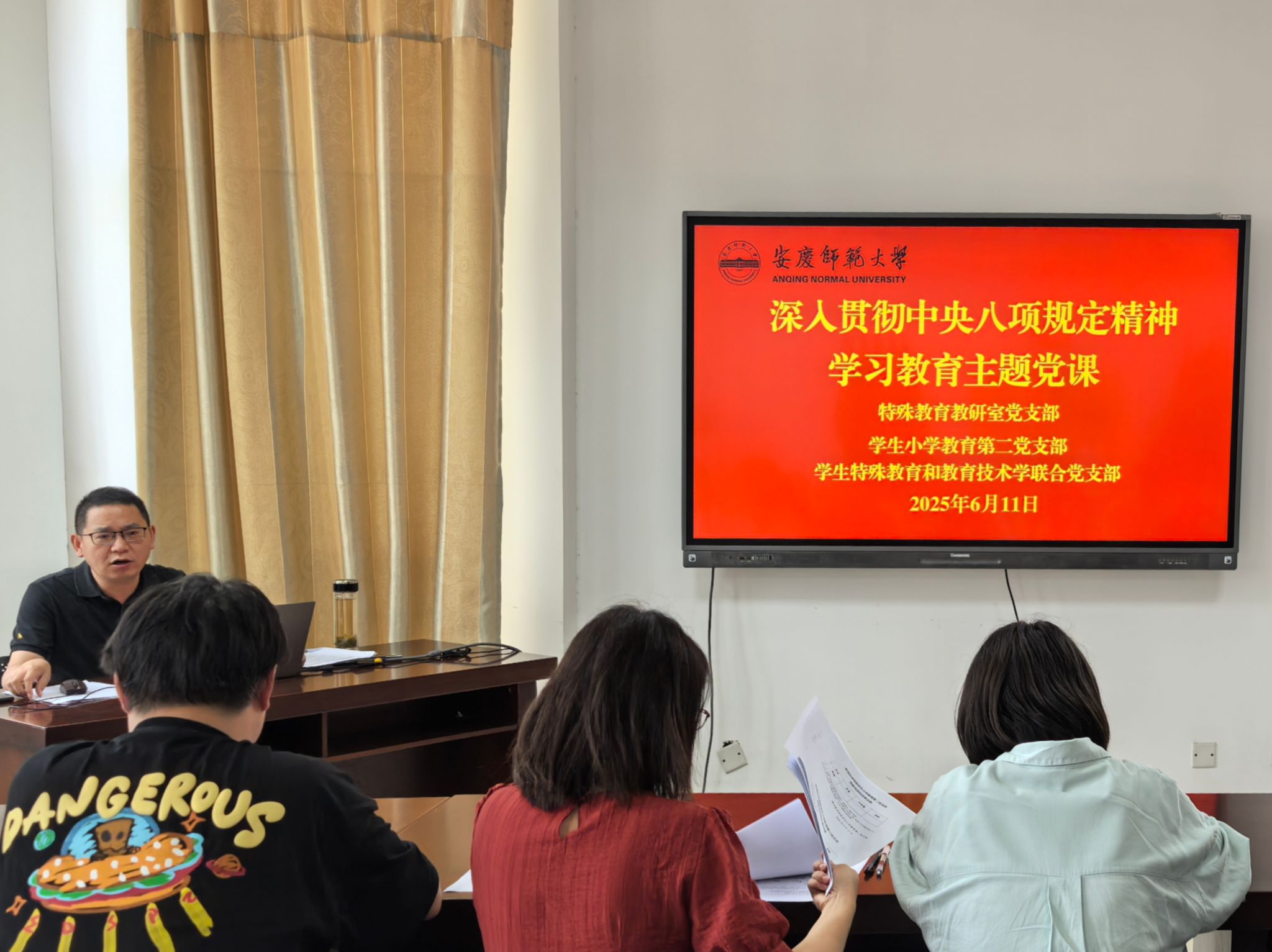 6月11日,公司党委书记何孔蛟在J202会议室为特殊教育教研室党支部、员工小学教育第二党支部、员工特殊教育和教育技术学联合党支部党员讲授深入贯彻中央八项规定精神学习教育专题党课。