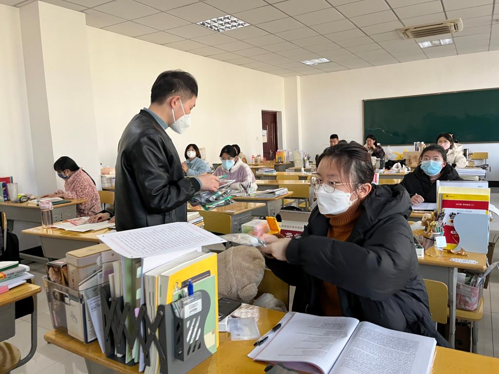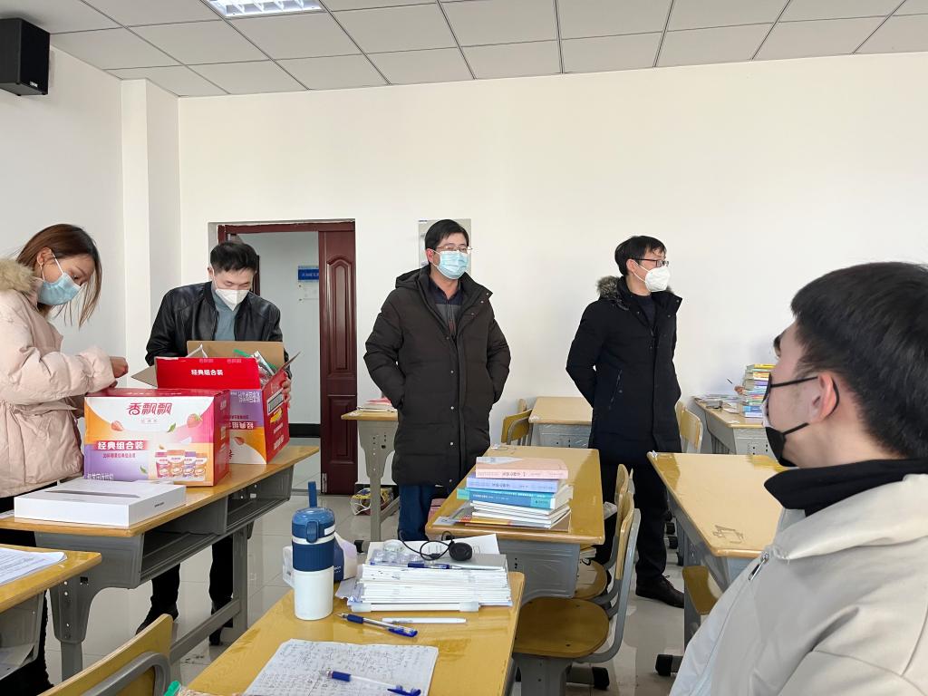 陈志超询问了员工近期学习和生活情况,为同学们答疑解惑,同时就当下寒冷天气如何做好考研规划和调节好心理状态做了针对性的引导。许世平强调,一要坚定考研信心;二要做好时间管理;三要调整好心态和生物钟;四要注意自身安全,无论在校内还是校外住宿考研的同学,一定要做好疫情防控防范,保护好自己的人身、财产安全。辅导员老师为备考员工发放了精心准备的慰问品。