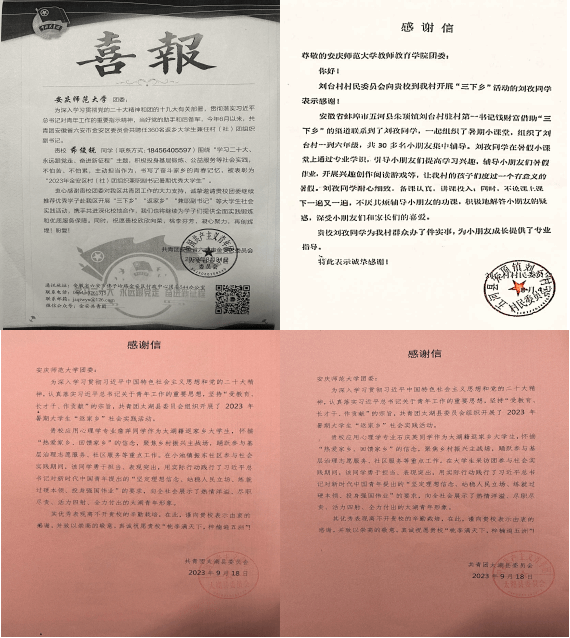 怀着一颗赤子之心,刘孜走进蚌埠市五河县朱顶镇刘台村,借用自身专业知识开展了暑假小课堂活动。在辅导小朋友作业的同时引导他们提升学习兴趣,带领孩子们度过了一个不同凡响的暑假。活动结束后,她收获了刘台村村名民委员会的真挚感谢。