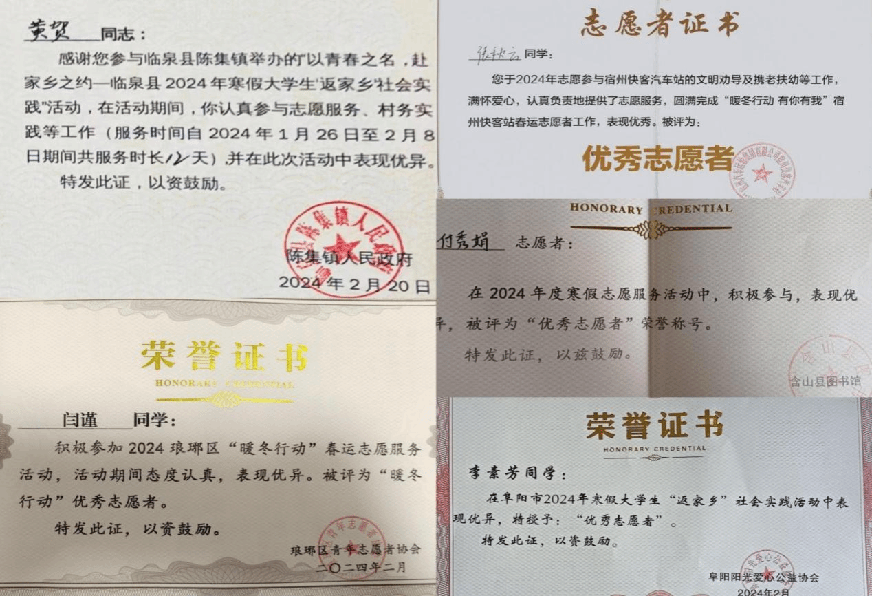 在2024年寒假期间,太阳成集团122ccvip数十名同学积极参与了“返家乡”社会实践活动,在反哺家乡、建设家乡的过程中磨砺成长,并因其卓越的表现受到了地方社区及团组织的赞誉,荣获“优秀志愿者”荣誉称号。此次“返家乡”社会实践活动为同学们提供了一个深入了解基层、在社会大课堂中接受锻炼、增长才干、贡献力量的宝贵机会,将书本知识与群众实践进一步结合,充分展现了新时代青年的风采与力量。