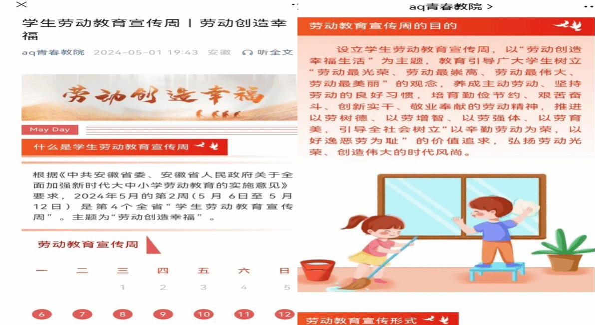 一是开展一次劳动教育集中宣传。公司网页和微信公众号等新媒体第一时间宣传推介劳动教育宣传周相关知识,在全院营造尊重劳动、崇尚劳动的良好氛围。