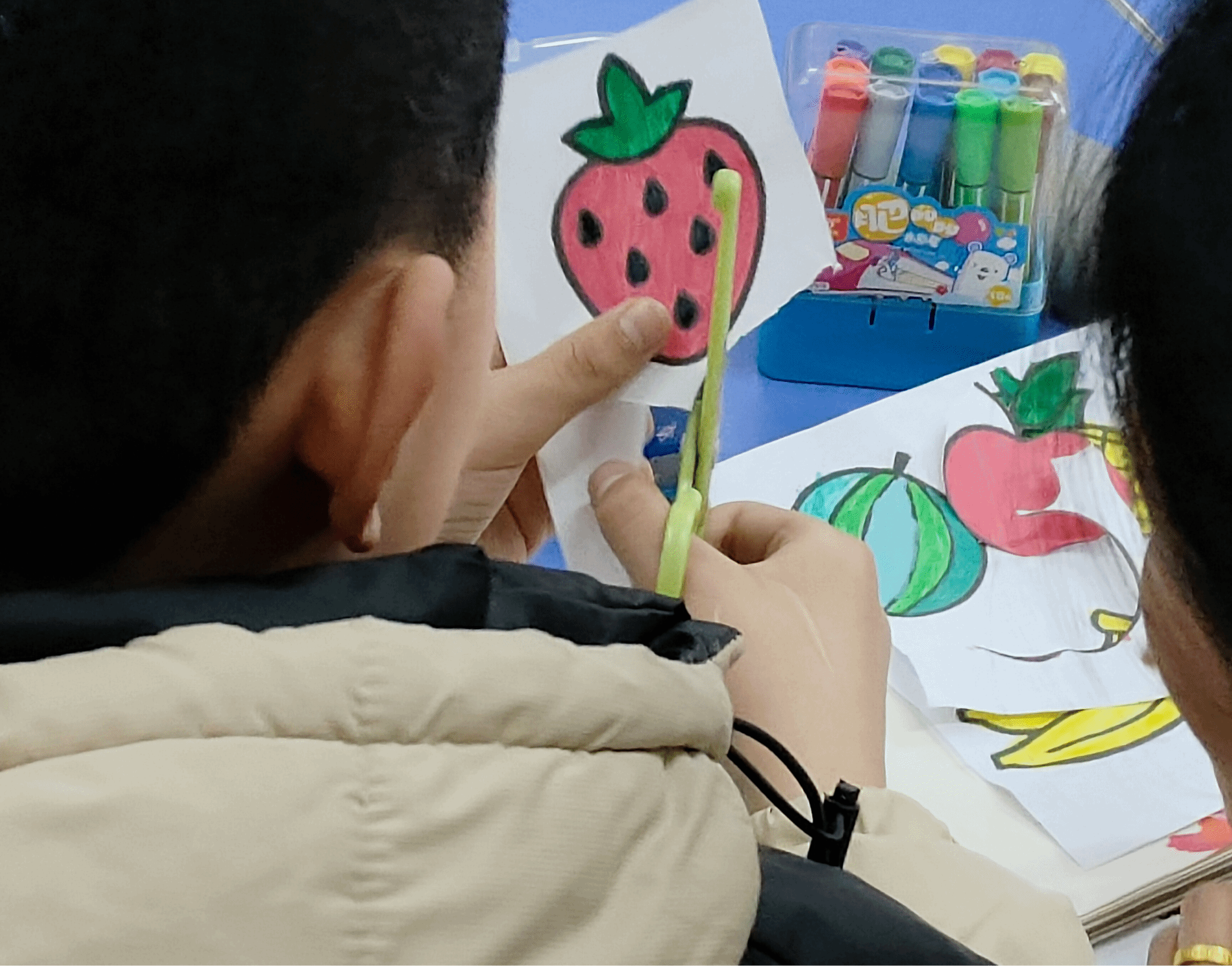 活动伊始,志愿者们以亲切的笑容和温暖的问候,主动与自闭症儿童打招呼,迅速拉近了彼此的距离。伴随着捉迷藏音乐游戏的展开,让这群“来自星星的孩子”与志愿者们从陌生到熟悉,逐渐变得放松和自信。手工美术课上,志愿者带领小朋友们绘画并裁剪出一个个可爱的水果图案,并将五颜六色的水果图案贴在自己的小篮子上,锻炼他们的颜色认知和动手能力。