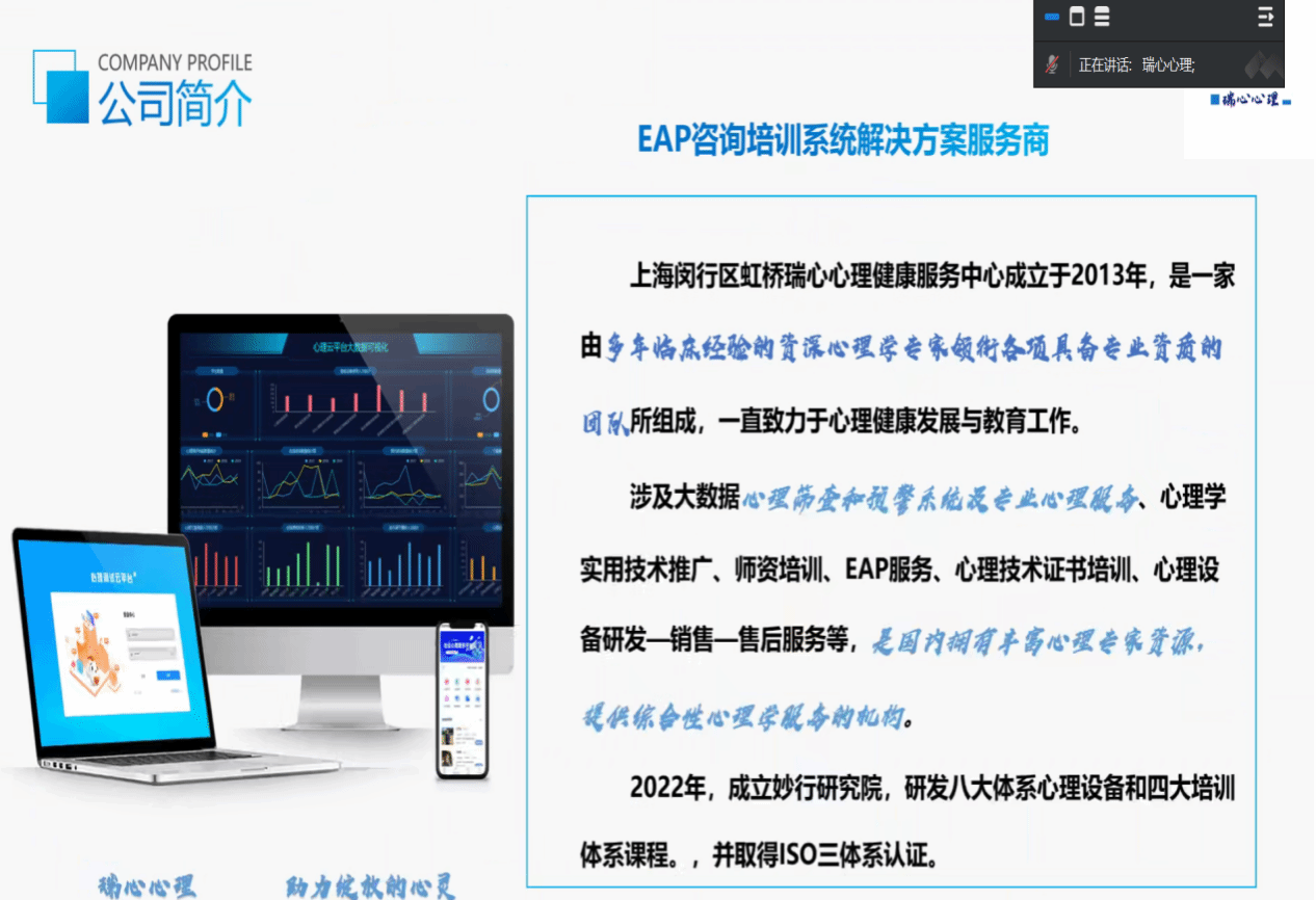 会议中,周经理根据自身经历,向同学们分析了当前就业形势、职业选择方向与发展前途,并就企业经营模式、就业岗位职责、当前用人需求及职业发展规划等方面提供了多方位的行业知识和就业信息,帮助应届毕业生深入了解,做好就业规划。随后,他通过播放宣传片、PPT展示、线上连线交流的方式从关于我们、发展历程以及核心规划等多个方面为同学们介绍工作岗位和工作情况,本公司一直致力于心理健康发展与教育工作,涉及大数据心理筛选,EPA服务等方面。